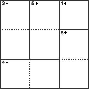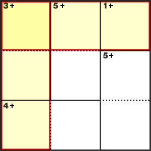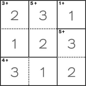 The heavily-outlined areas are called “cages.” The small number in the upper-left corner of each cage is our “target number.” The math symbol next to the target number tells us which operation we’ll be using in that cage. This puzzle uses only addition.