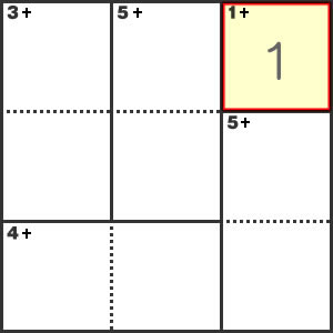 The top-right corner is a single-square cage with a target number of 1. So we know we can only put 1 in there.
