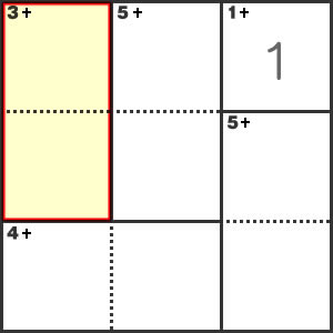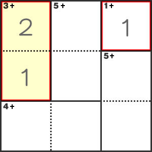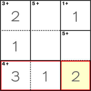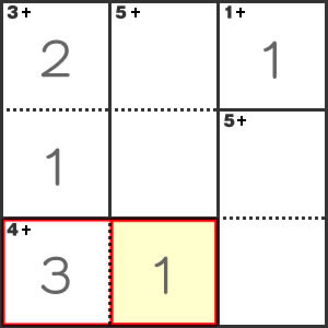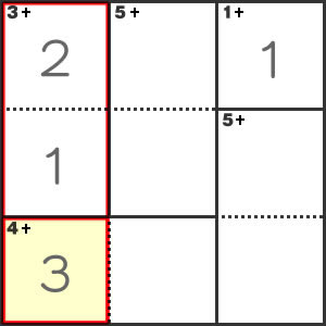 See the cage we’ve highlighted in red? It’s two squares with a target number of 3, and we’re using addition. So the only combination of two numbers between 1 and 3 that will add up to our target number (3) is… 1 and 2. But which square gets the 1 and which gets the 2?