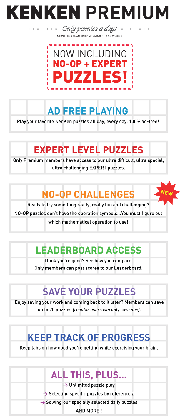 We would love to provide everyone an ad-free experience, but we do need to generate revenue to cover at least some of our overhead. We're trying to be as reasonable as possible, and it also allows us to continue to offer you an option to access KenKen puzzles for free. For those who prefer an Ad-Free playing experience, we have an option for just pennies-a-day and it can be canceled anytime. BONUS! KenKen Premium also allows you to Track Your Progress, Join The Leaderboard, Save Puzzles, and more. Please consider this option for the best experience.